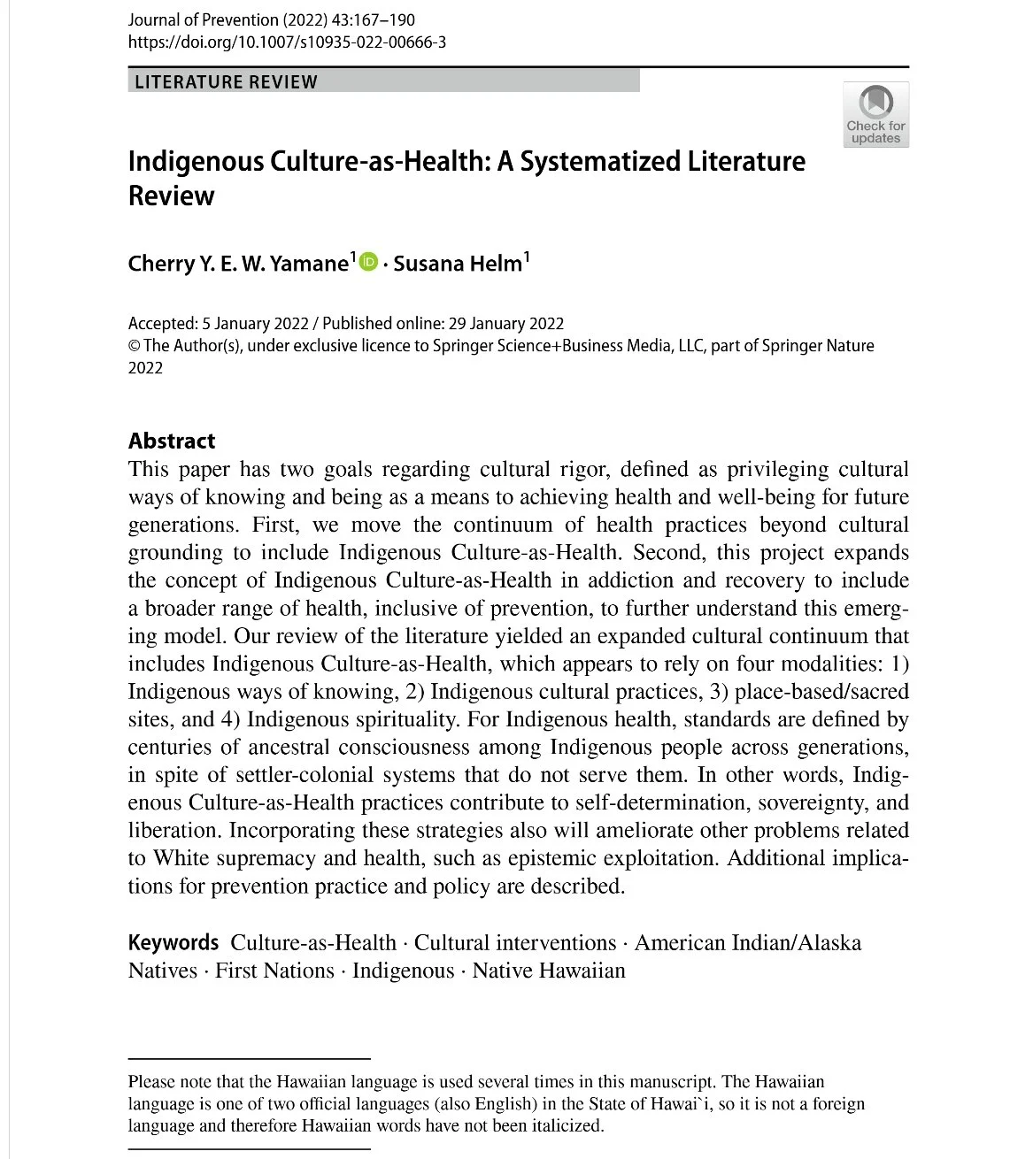 Yamane, CYEW & Helm, S. (2022). Indigenous Culture-as-Health: A Systematized Literature Review. Journal of Prevention 43 (2), 167 – 190. DOI 10.1007/s10935-022-00666-3.