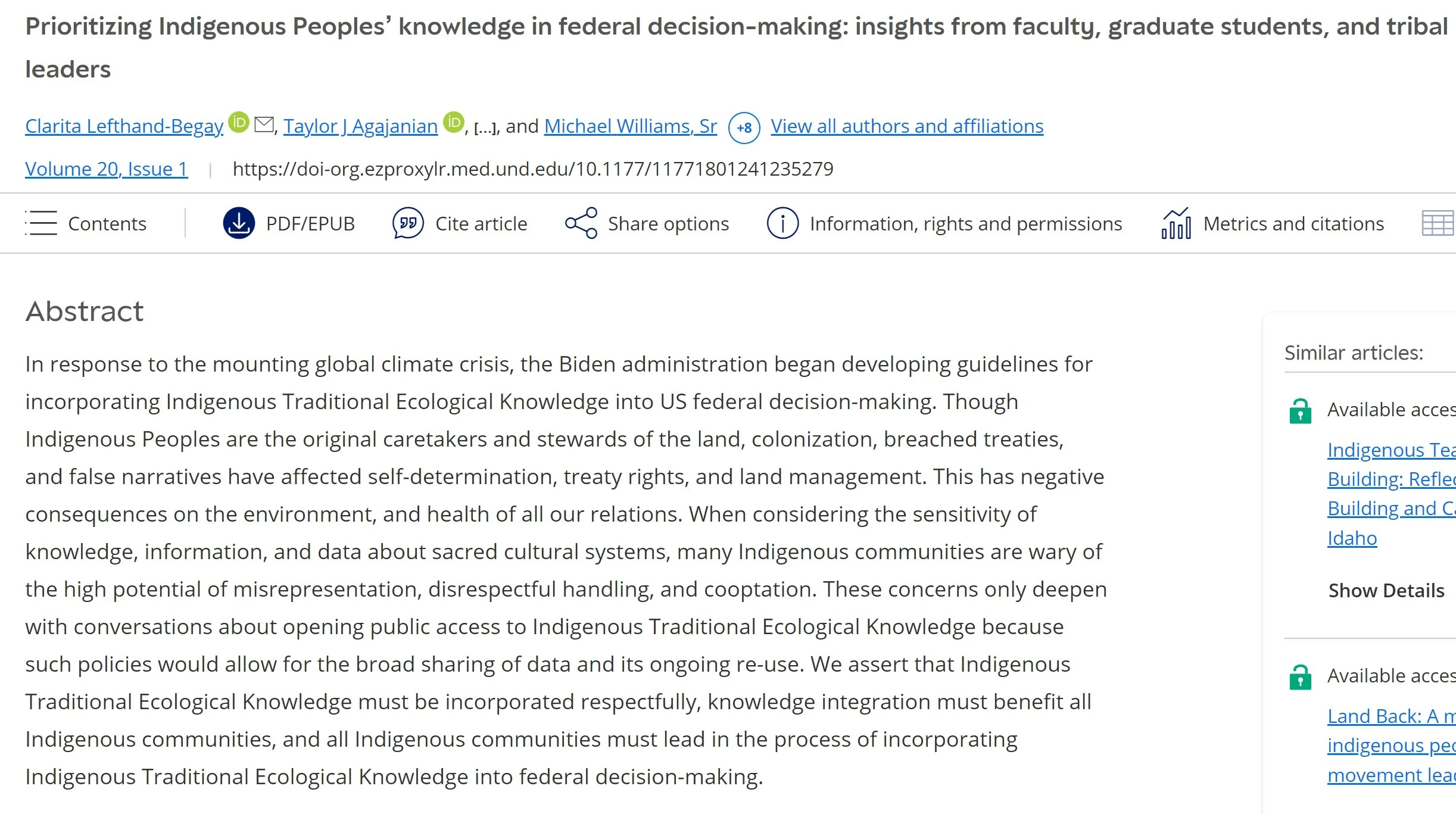 Agajanian, T., Carbajal, I., Duncan, C., La Torre, J., Lefthand-Begay, C., McCarty, M., Rose, J., Ruhm, R., Sheban, C., Yamane, CYEW., Williams, M. (2024). Prioritizing Indigenous People’s Knowledge in federal decision-making: insights from faculty, graduate students, and tribal leaders. AlterNative: An International Journal of Indigenous Peoples, 0(0). https://doi.org/10.1177/11771801241235279.